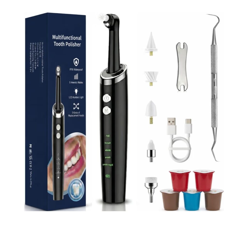 “😁 Premium Electric Teeth Cleaner & Polisher – Brighten Your Smile Anywhere Take control of your dental care with this 5-Mode Rechargeable Teeth Cleaner & Polisher Kit. Equipped with multiple attachments, LED light, and waterproof design, it’s perfect for safe, effective cleaning at home or while traveling. ✨ Key Features